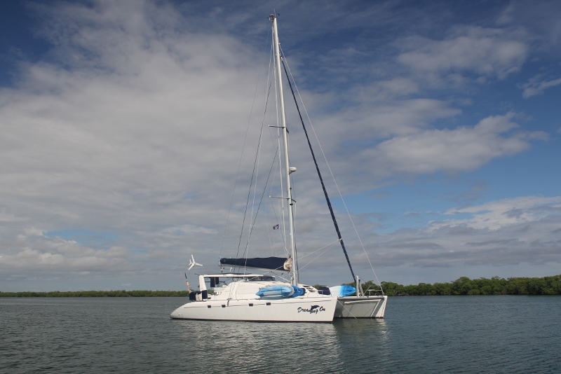 Dreaming On is a 47 foot catamaran, offering 3 guest cabins with accommodation for 6 in an exclusive, un-crowded environment. The salon is roomy with an all around view and a ''U' shaped fully appointed galley. There is a large dining area with a custom made dining table of Guatemalan hardwood.